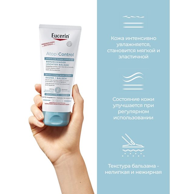 Успокаивающий бальзам для взрослых, детей и новорожденных Eucerin Atopi Control от атопического дерматита мгновенно увлажняет, делает кожу мягкой и гладкой. Если им пользоваться регулярно, состояние кожи заметно улучшится.